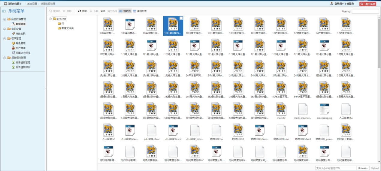 主要是對普查所需的數據進行管理,包括氣象數據,致災因子數據、承災體數據、范圍數據、權重數據、孕災環境系數、基礎地理信息數據、災情調查數據等。