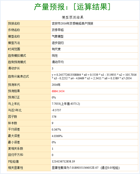 具有模型名稱、模型方法、趨勢產量預報模式表達式、氣象產量預報模式表達式、置信水平、重大災害產量訂正選擇、預測結果、與上年比較、近5年比較,因子數及說明、樣本數等。